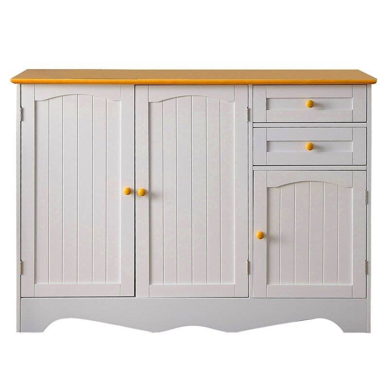 This White Wood Sideboard Buffet Cabinet with Light Wood Finish Top and Knobs is a counter, cupboard, and storage space all wrapped into one charming piece of furniture. It also has enough storage for all of your kitchen gadgets and tools or other type objects, making it a tremendous value as well as a great space saver for your house. It also used to provide added storage and work space for the kitchen and dining areas of the home. White finish cabinet with a natural top providing lots of storage with two utility drawers, two cabinets, one large and one smaller. Don't hesitate, it will be a great choice to buy, take it to your home now!
